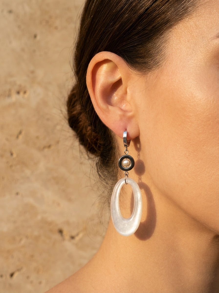 Make a bold yet refined statement with these sculptural drop earrings that blend contemporary design with natural elegance. Each earring features a striking combination of materials that create beautiful contrast and movement.