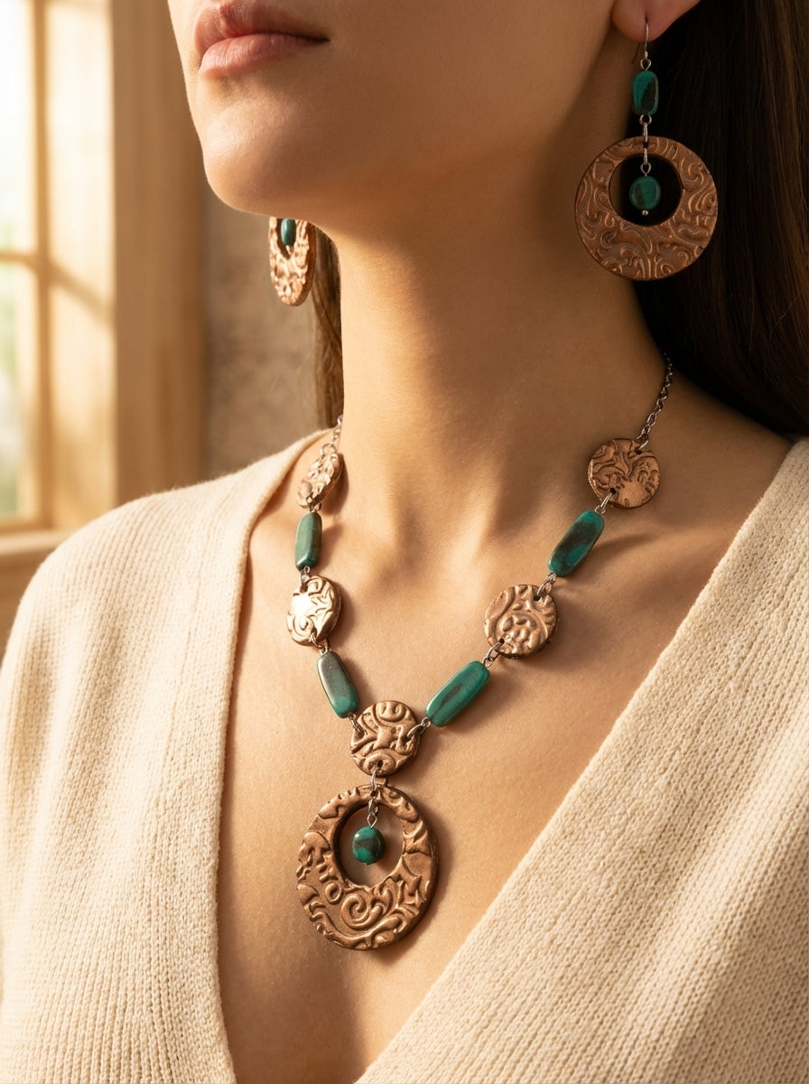 Statement circular necklace with warm bronze tones and a subtle turquoise handmade clay beads.